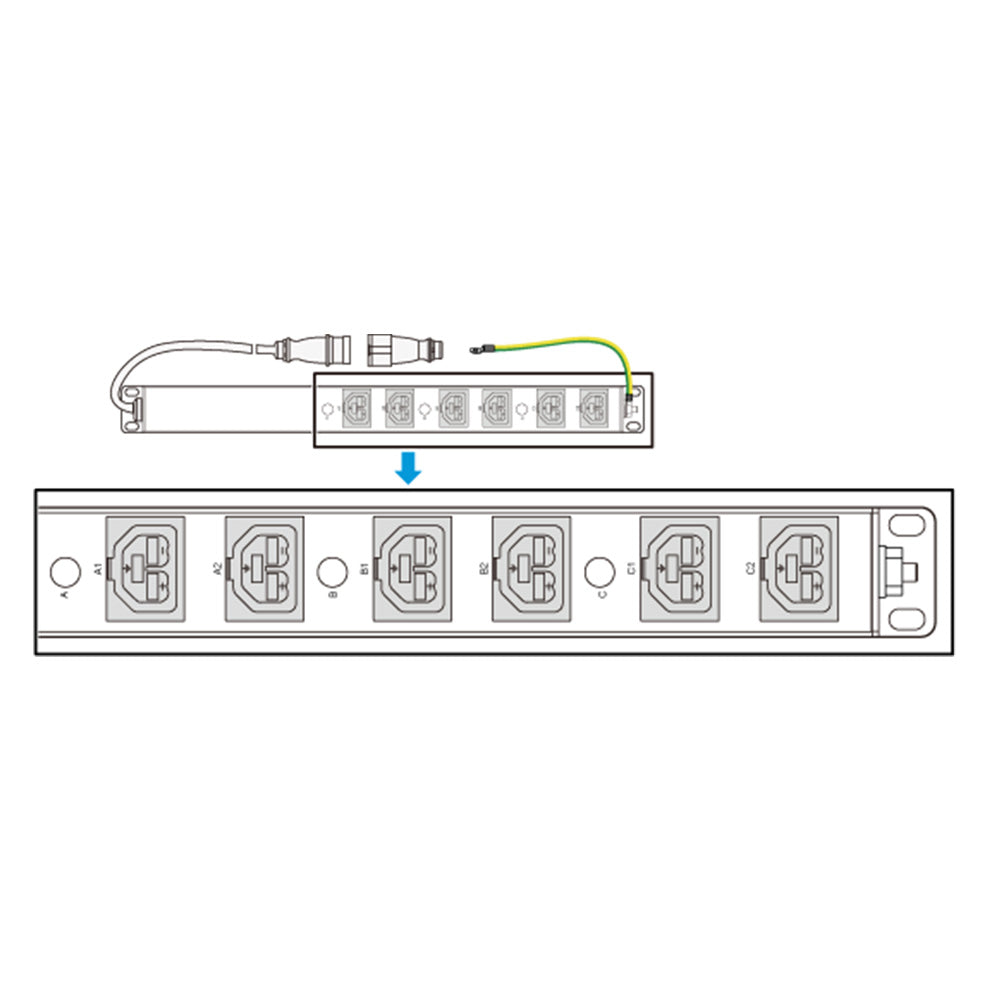 A 380 V three-phase PDU supports three-phase 346 V to 415 V AC power input and provides three groups of power outputs A, B, and C. Each group controls two HVDC-3Z-03 sockets. When the groups are connected to a chassis, the total current of all sockets in each group cannot exceed 32 A.