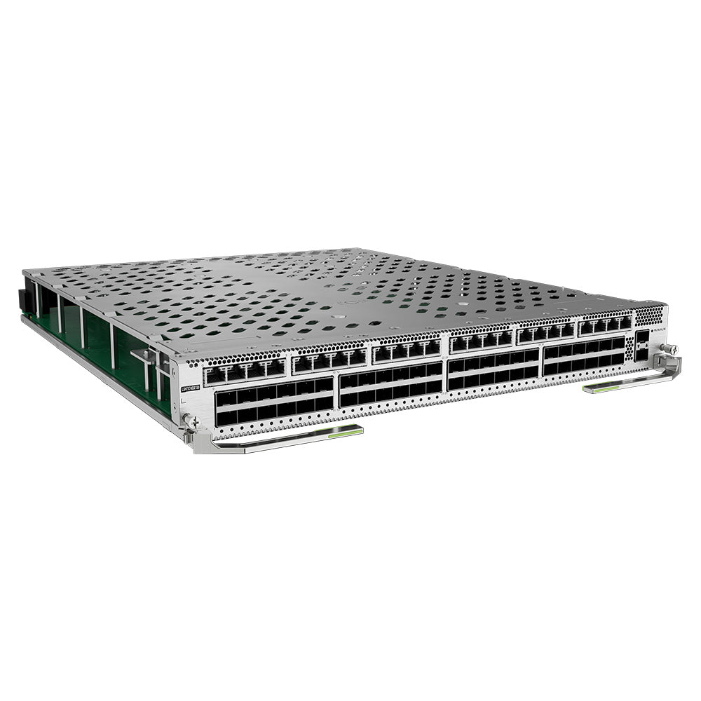 The card provides data packet processing and traffic management on 24 GE electrical ports, 48 10GE optical ports and 2 25GE optical ports. |