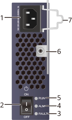 ALM ALM indicator Yellow Steady on A power output shutdown alarm, overtemperature alarm, output overcurrent alarm, input overvoltage alarm, or input undervoltage alarm has been generated.