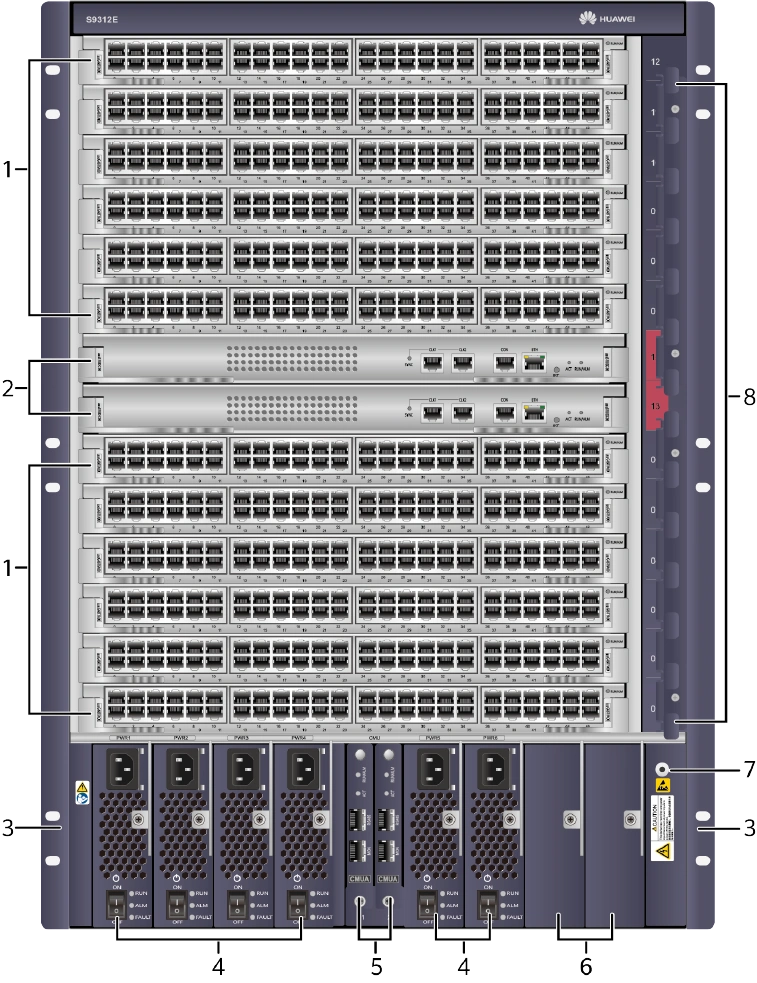 Huawei S9300 Series Switch S9312E 2* SRUs, 12* LPUs, and AC or DC power modules in N+N/N+1/N+0 (no redundancy) backup mode